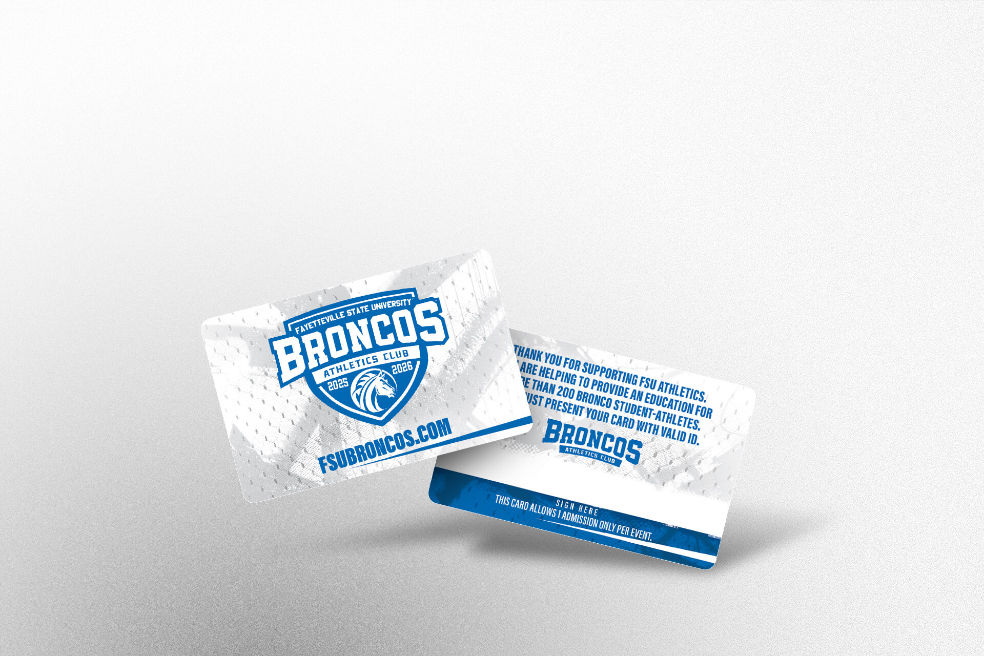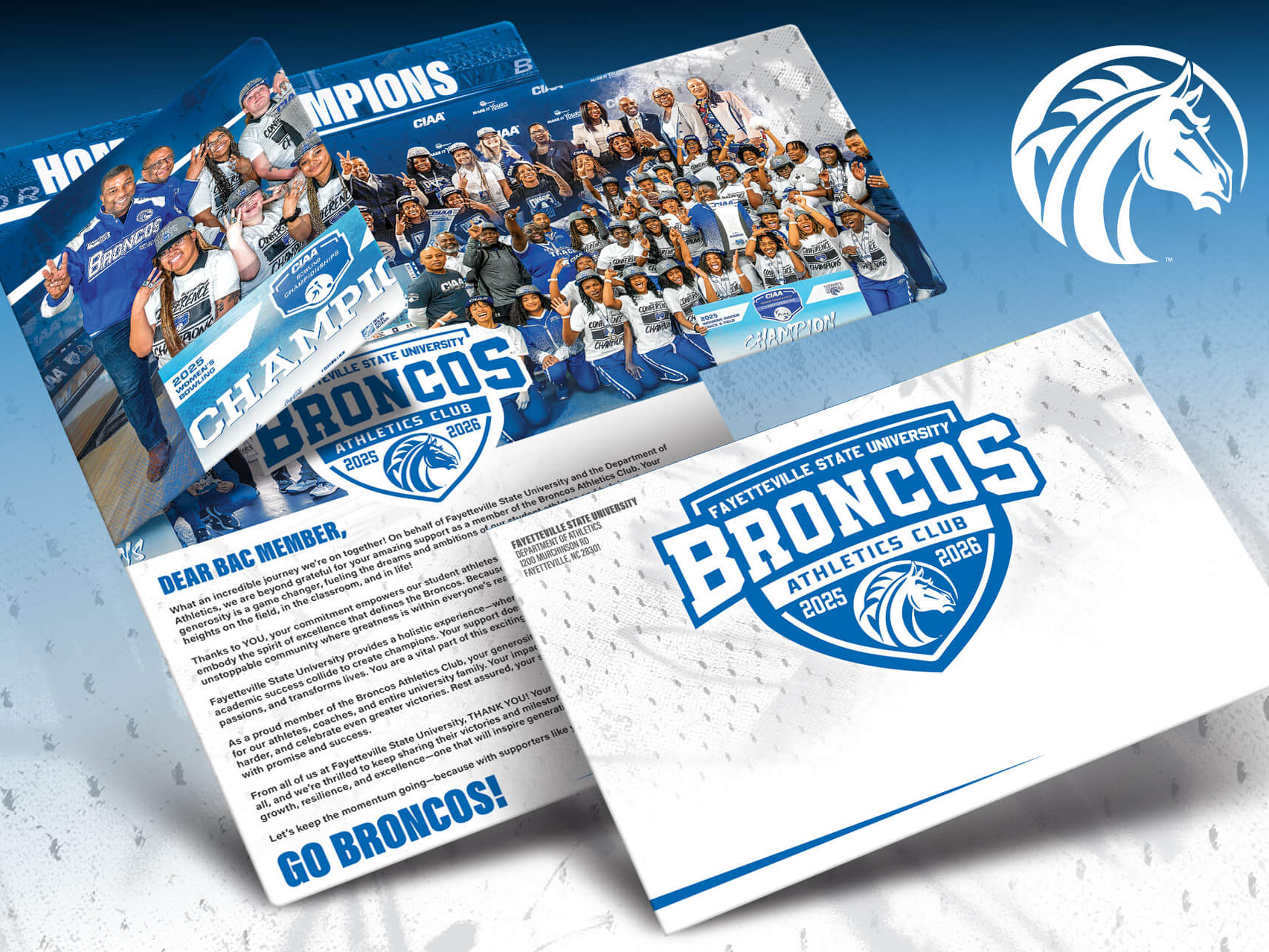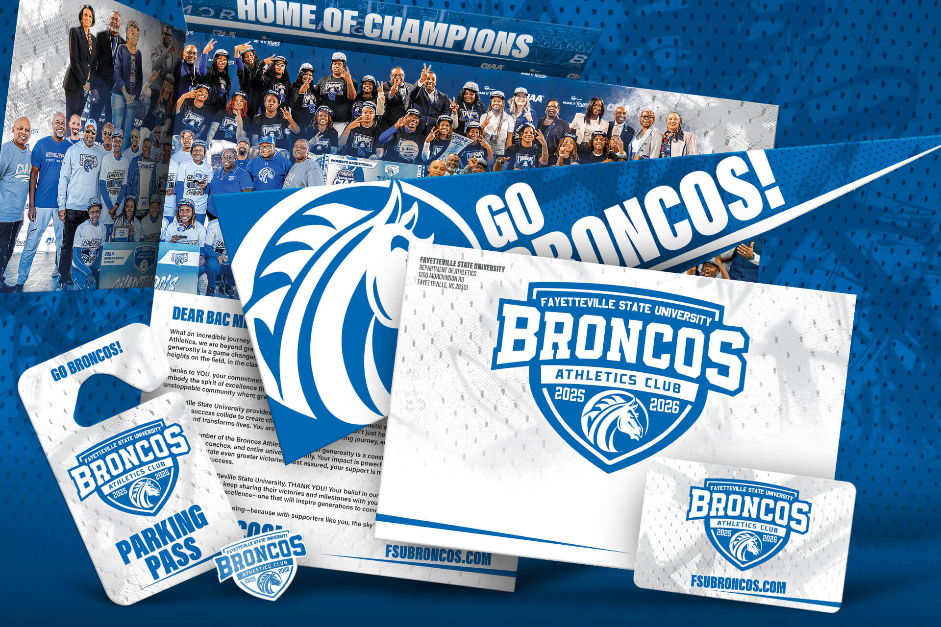 Client:Broncos Athletic ClubInstitution:Fayetteville State UniversityYear:2025Classification:Athletic DevelopmentFormat:Gatefold Pennant MailpieceComponent 1:Membership CardComponent 2:Hang TagComponent 3:Lapel PIN