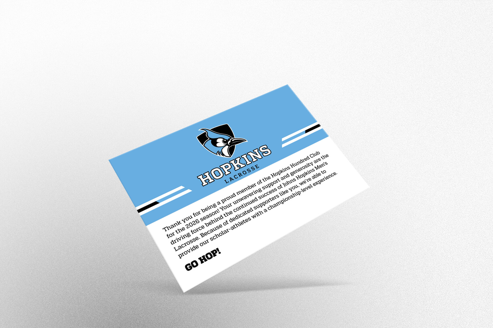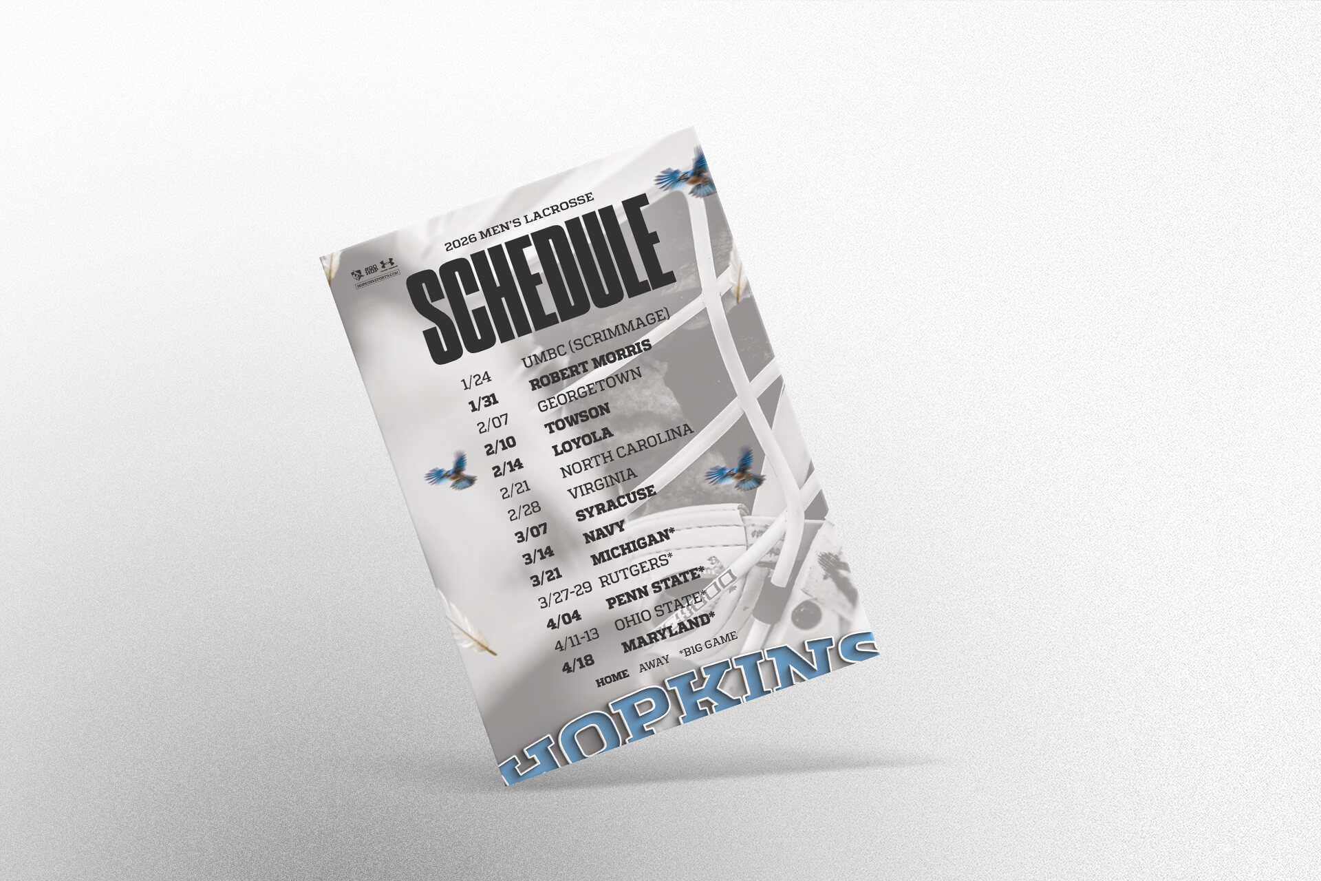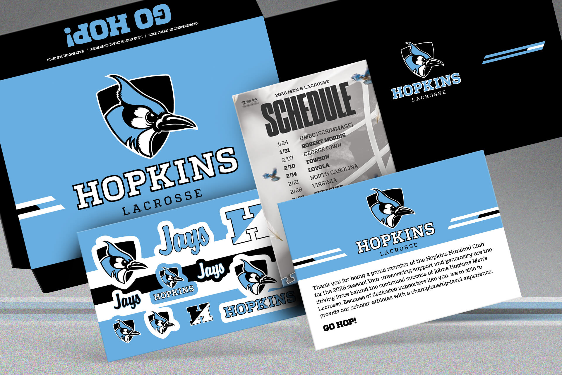 Client:JaybackersInstitution:Johns Hopkins UniversityYear:2025Classification:Athletic Development - LacrosseFormat:Elite EnvelopeComponent 1:Schedule MagnetComponent 2:Insert CardComponent 3:Sticker Sheet